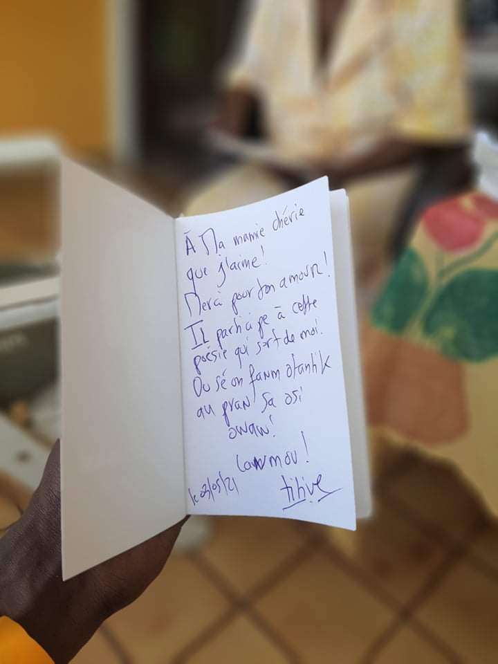 J’ai toujours pu lui parler de façon authentique. Elle ne mâche pas ses mots. J’aime tellement ça. Je peux lui parler de choses très personnelles. On rigole parfois comme des enfants. Lors de mon dernier séjour au pays, je suis passé voir cette grande dame. Avec toutes ces histoires de COvid et de confinement, ça faisait lontemps. Prudents, on a respecté la distanciation. Elle aime lire son petit-fils. Ma poésie lui doit beaucoup donc je lui ai laissé son exemplaire de mon premier recueil.